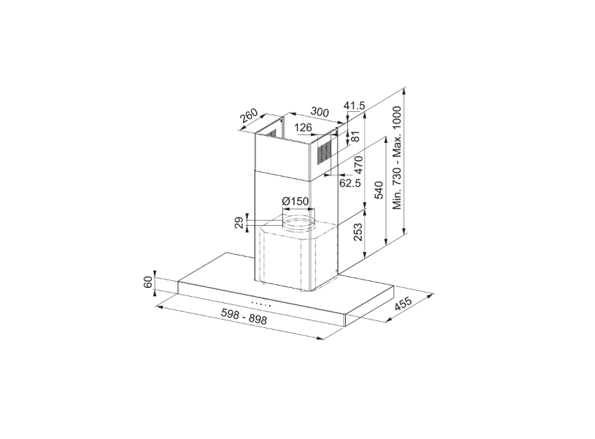 Kumanda paneli Dokunmatik çok fonksiyonlu, elektronik kumanda Aydınlatma 1 Watt’lık 2 LED lamba Filtre Çelik kaset Motor gücü 250 W Aspirasyon debisi 750 m3/h Ses 69 dBA Hız 3+1 Boru çıkış çapı Ø150 mm/Beraberinde verilen redüksiyon Ø120 mm Ek özellikler Comfort light, Intensive Speed Fonksiyonu, 30 dk. Auto stop çalıştırma programı